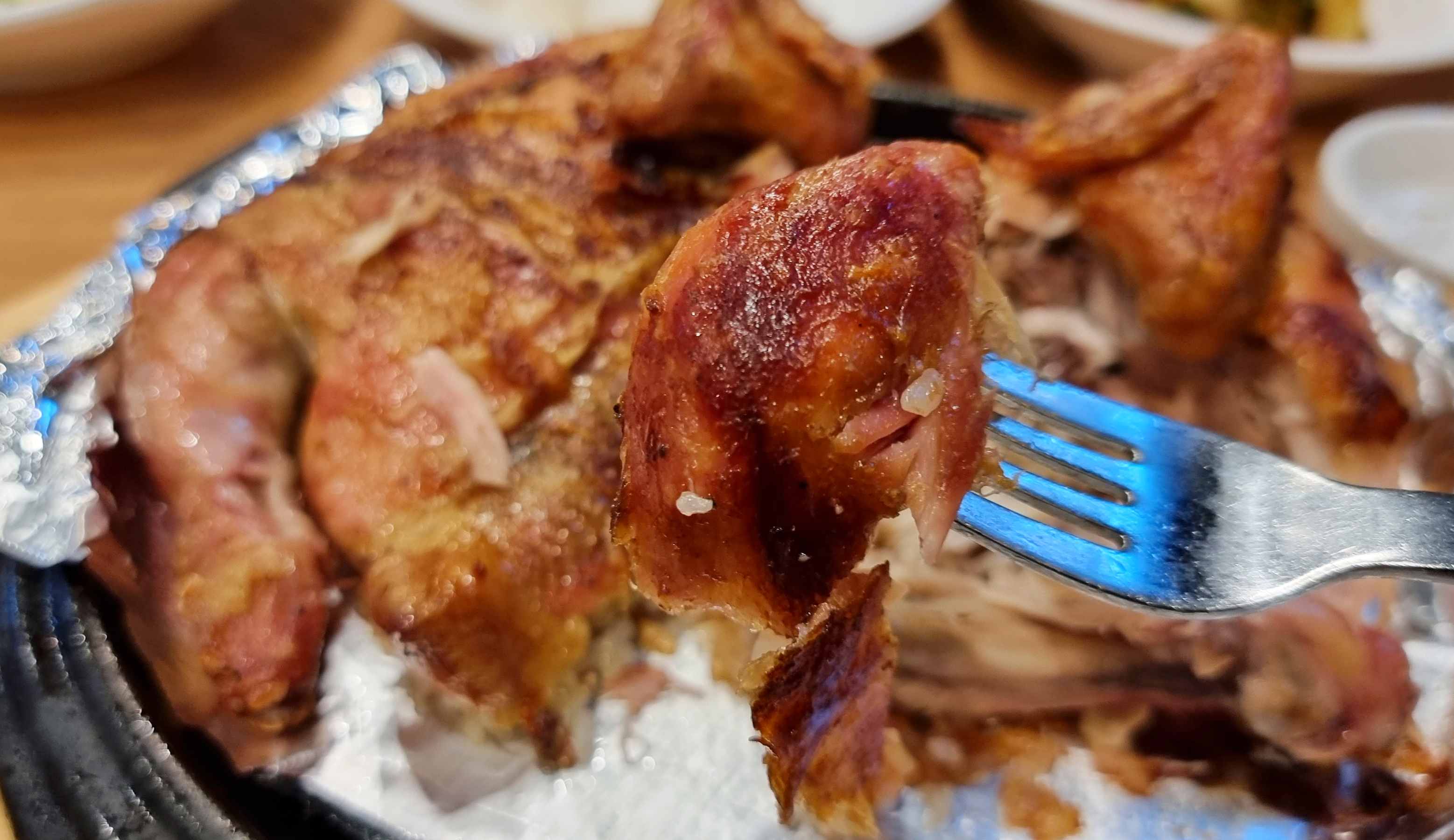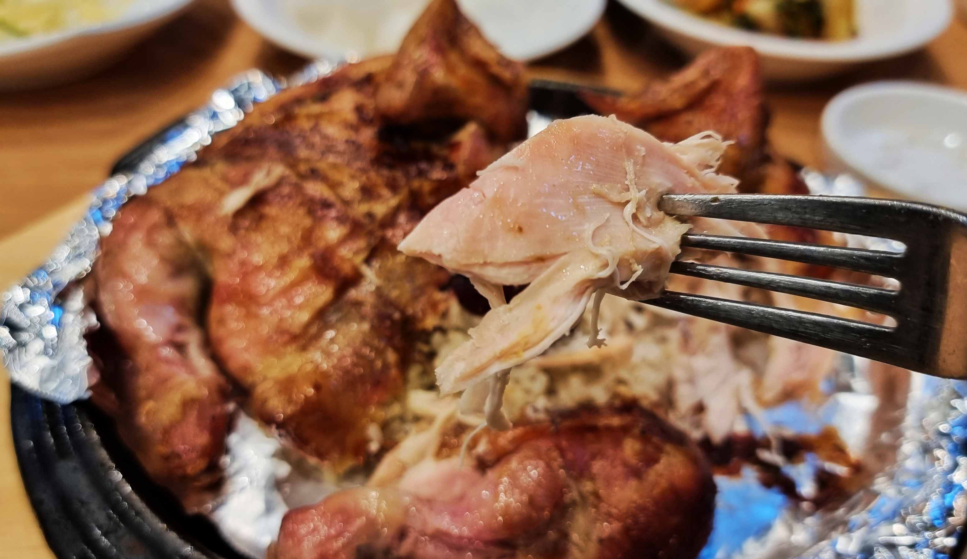 참나무 장작구이로 통닭의 기름기를 쏙뺐기때문에