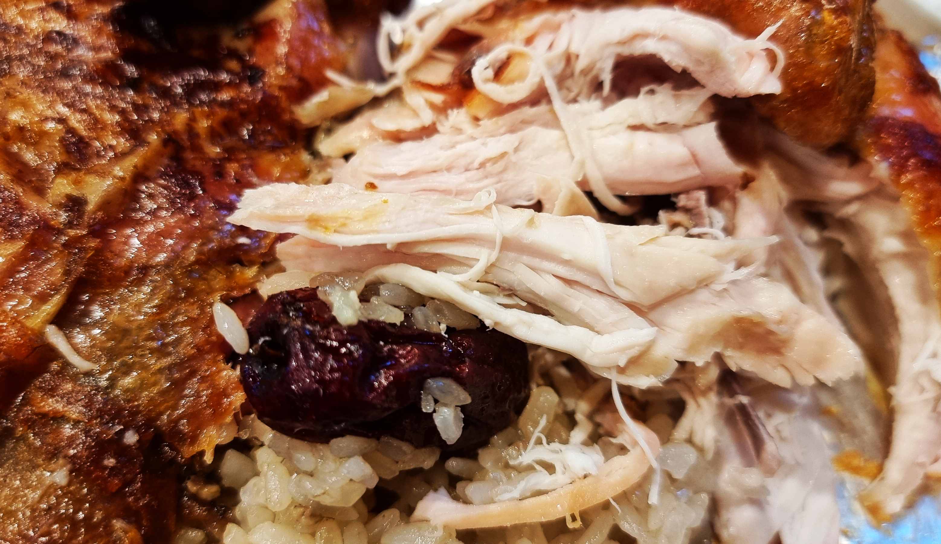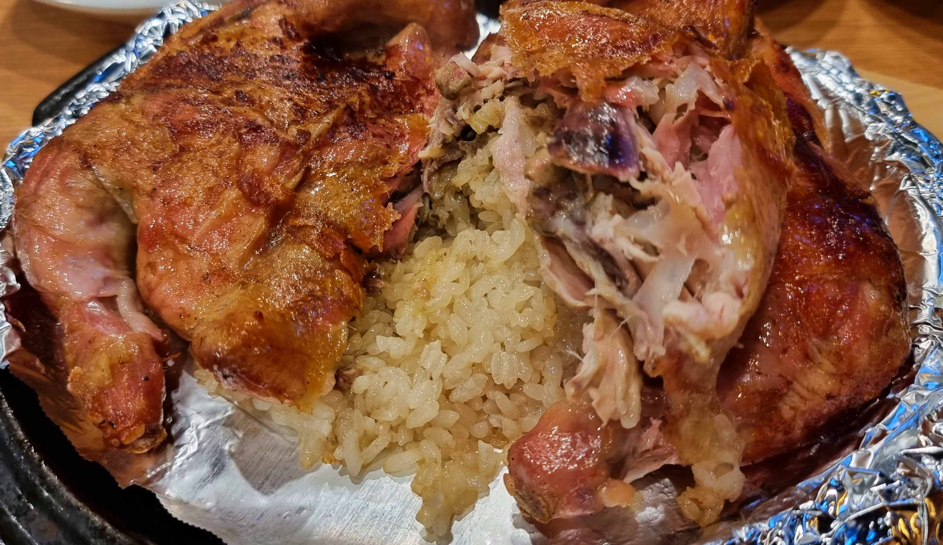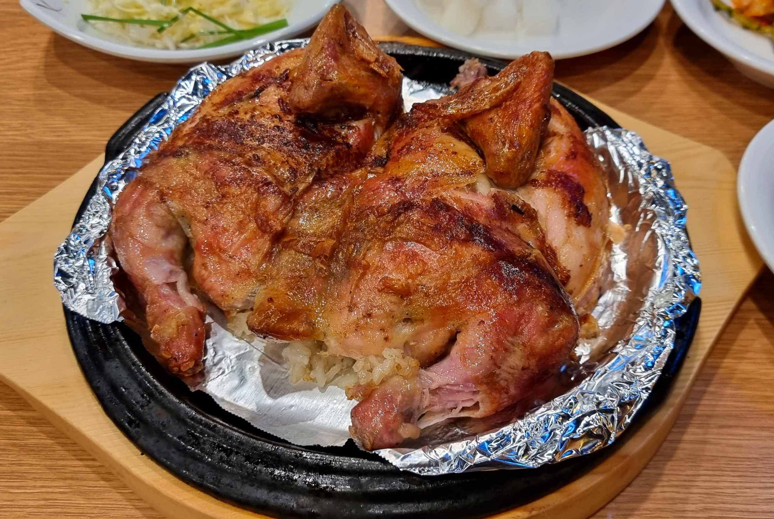 참나무 장작구이로 기름기를 쏙 뺀 통닭 속에는