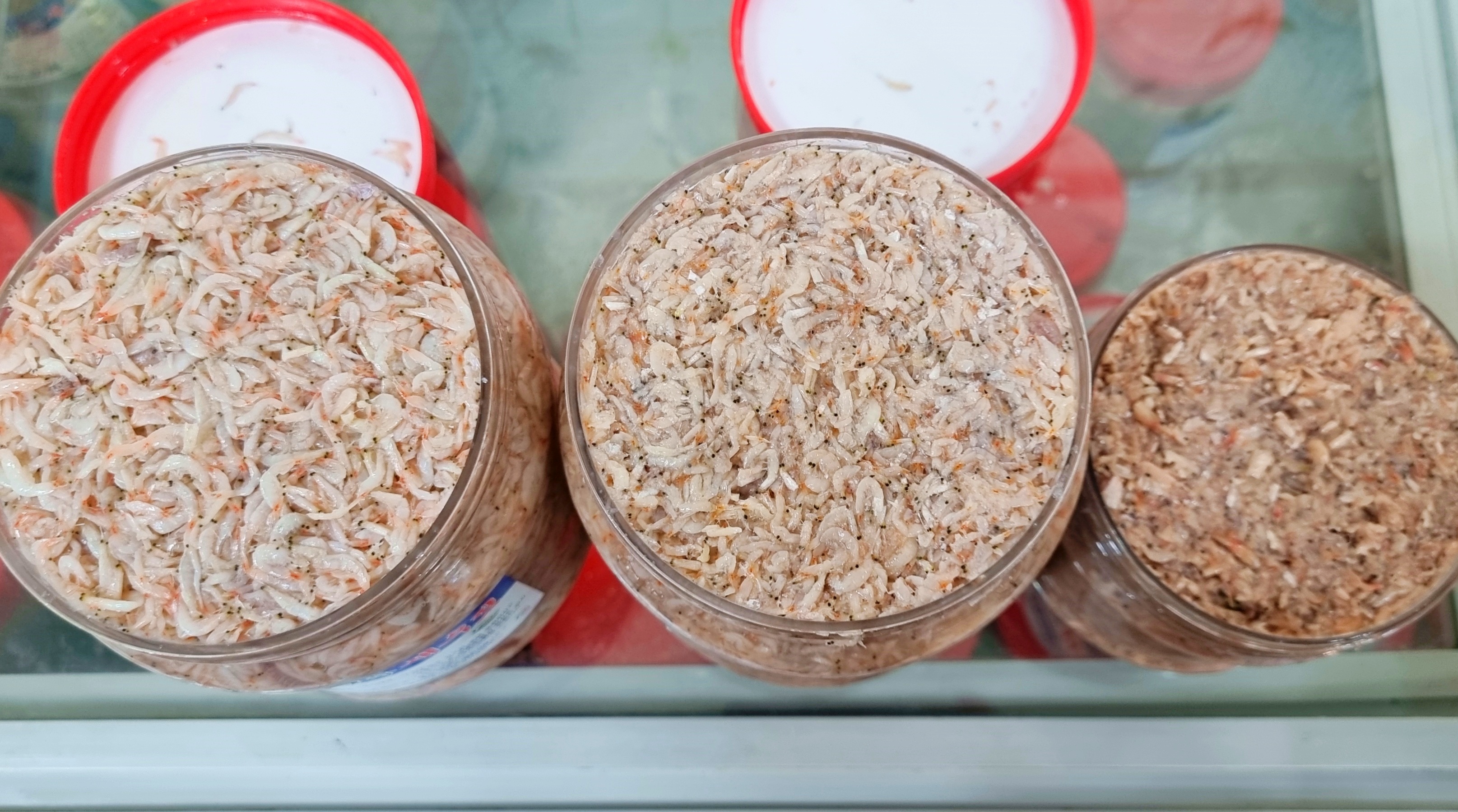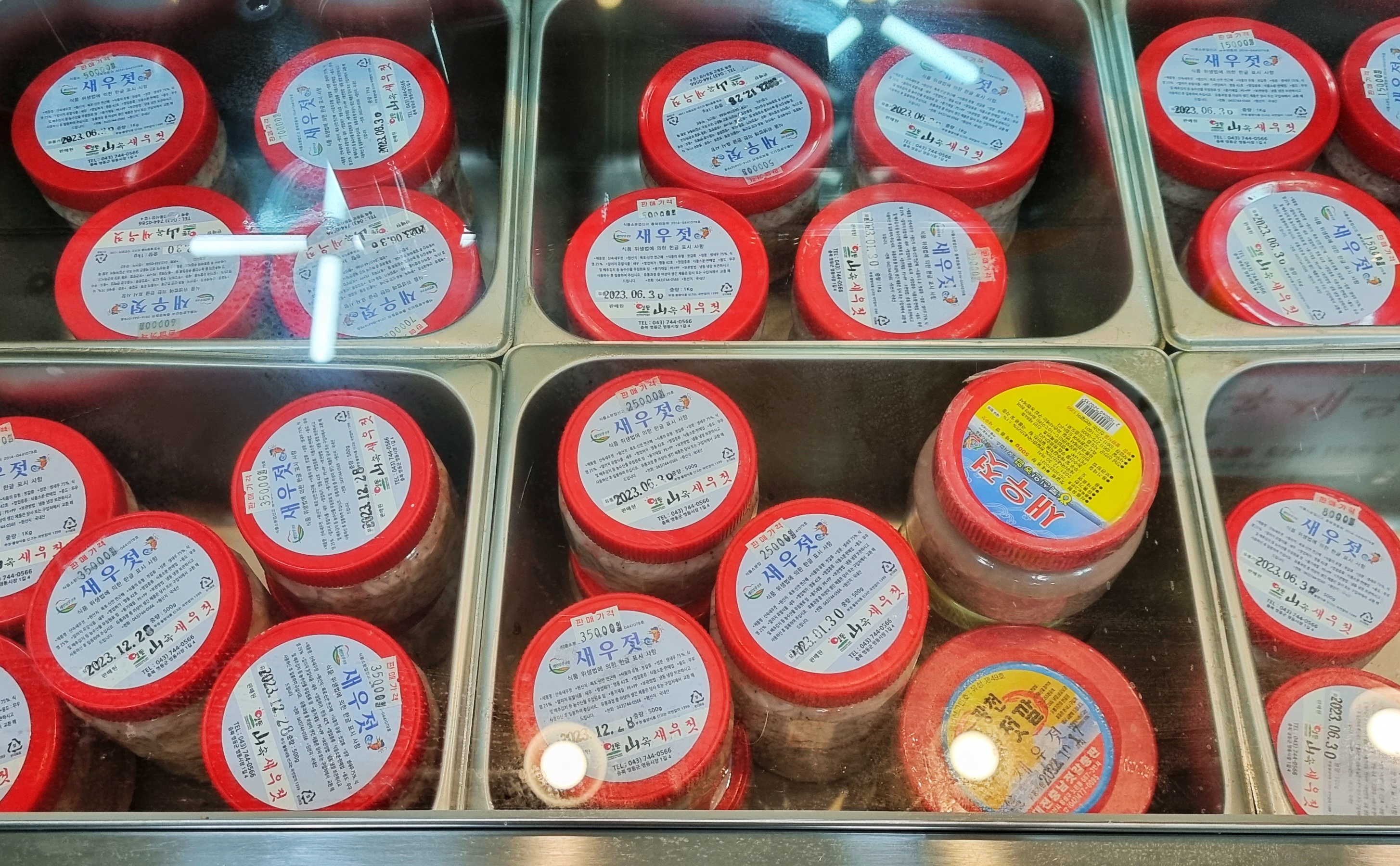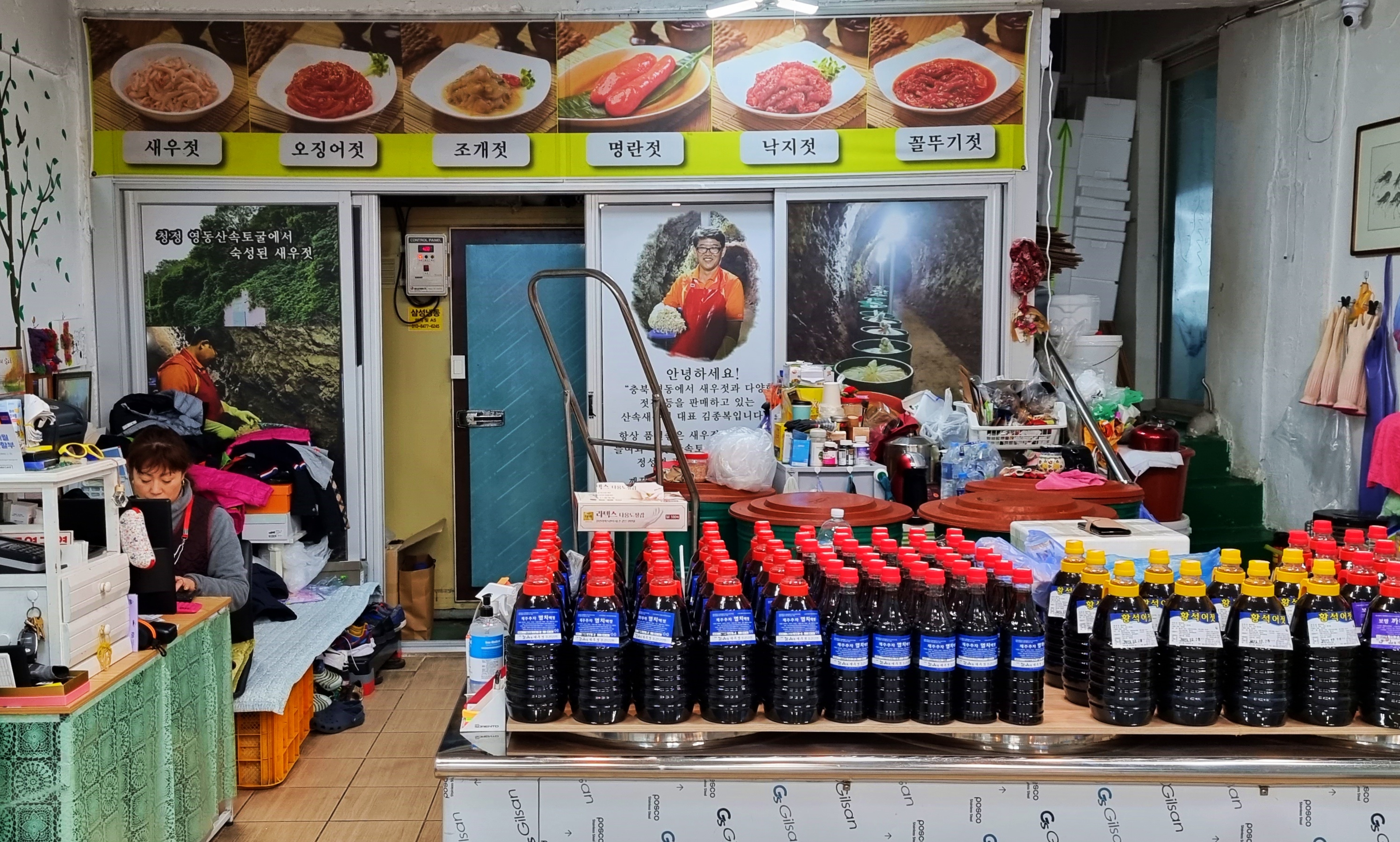 사장님이 여러 가지의 새우젓을 내놓고