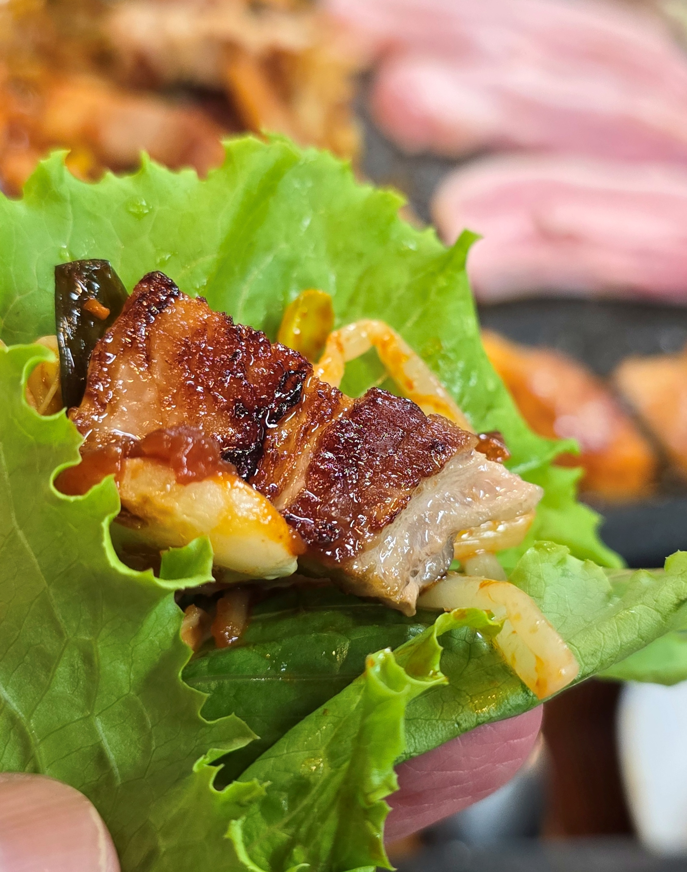 삼겹살은 두께감이 살아있고 선홍빛이 도는 신선한 생고기였습니다.