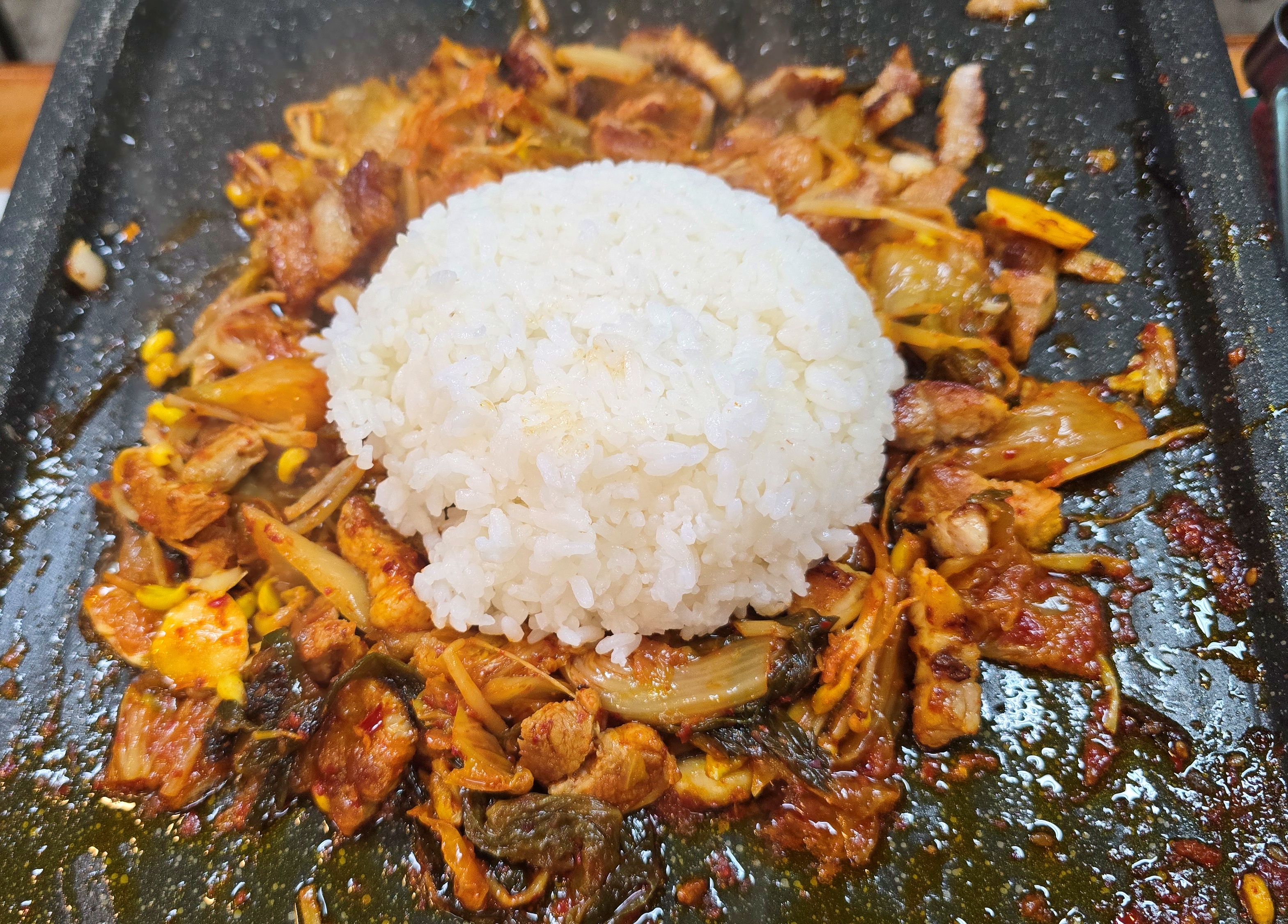 불판 위에서 볶아지는 이 세 조합이 정말 예술입니다.