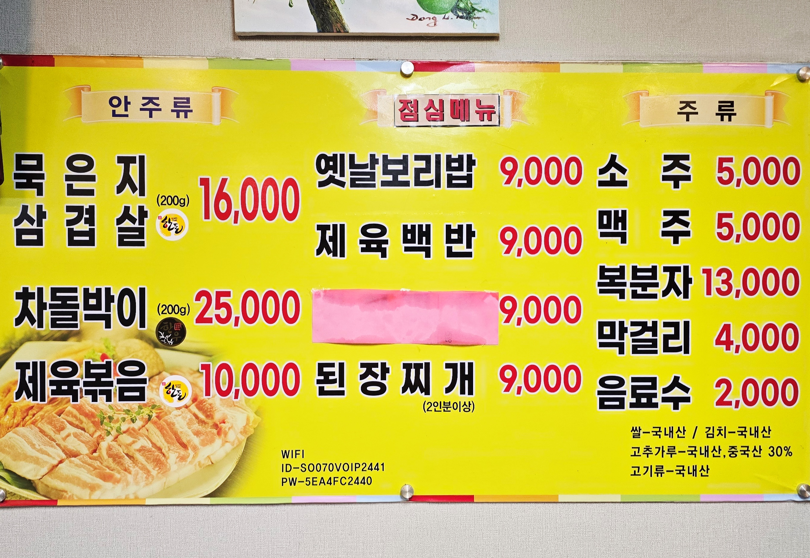 간판에는 ‘묵은지생삼겹살·제육볶음·보리밥·된장찌개’