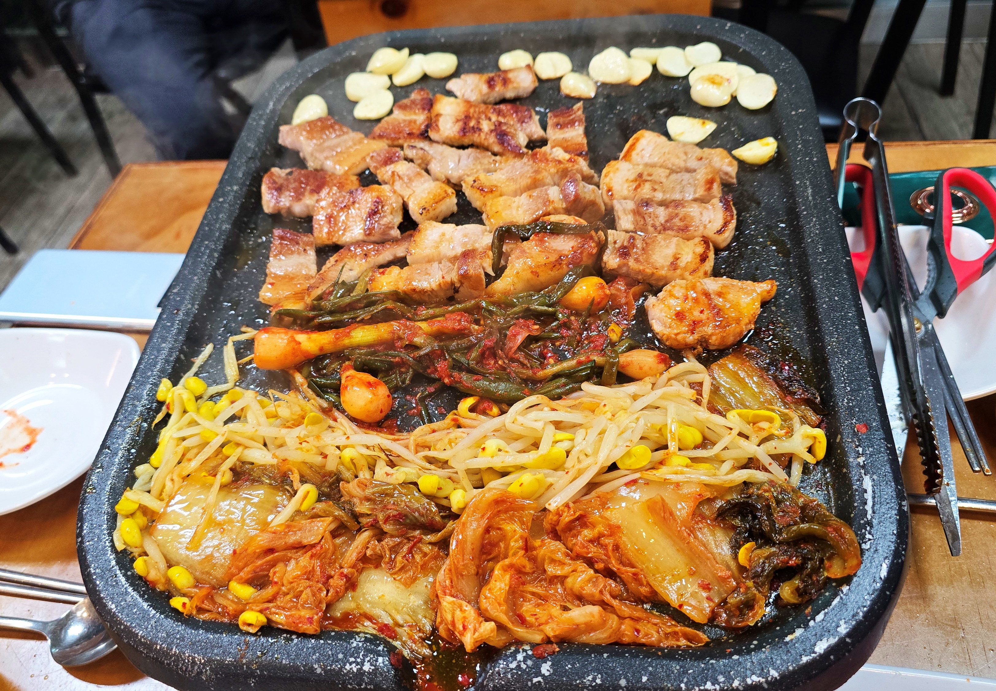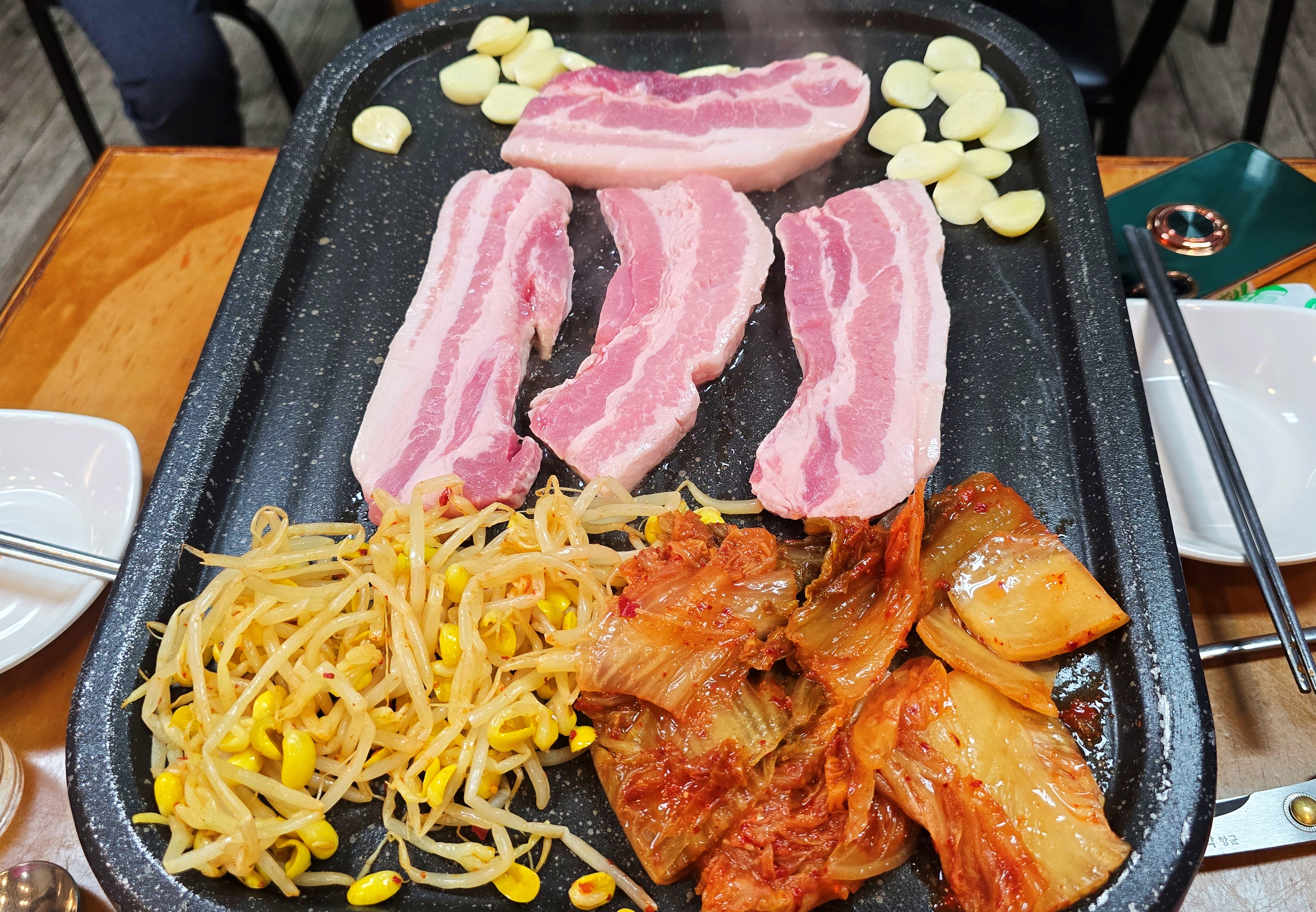 삼겹살 옆에는 콩나물무침, 묵은지, 마늘이 함께 올라가는데,