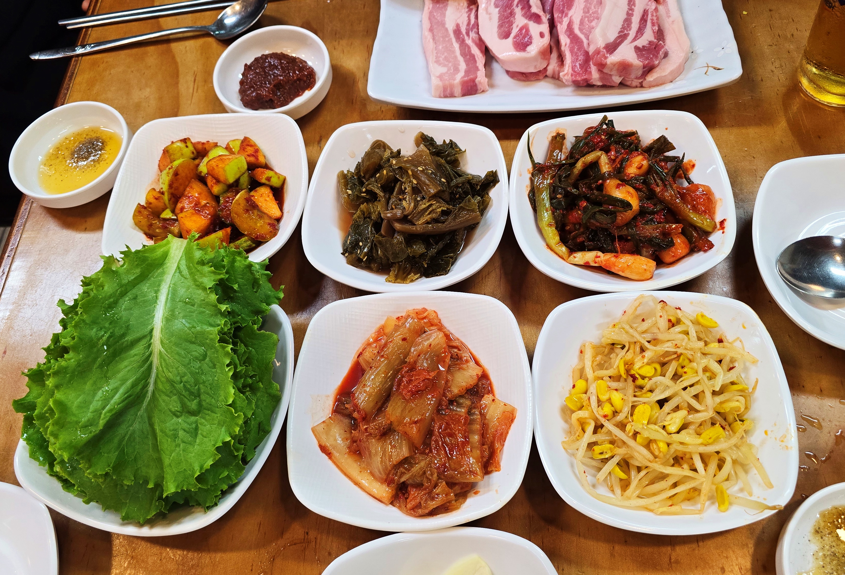 테이블 위에는 상추, 겉절이무, 김치, 콩나물무침, 열무김치