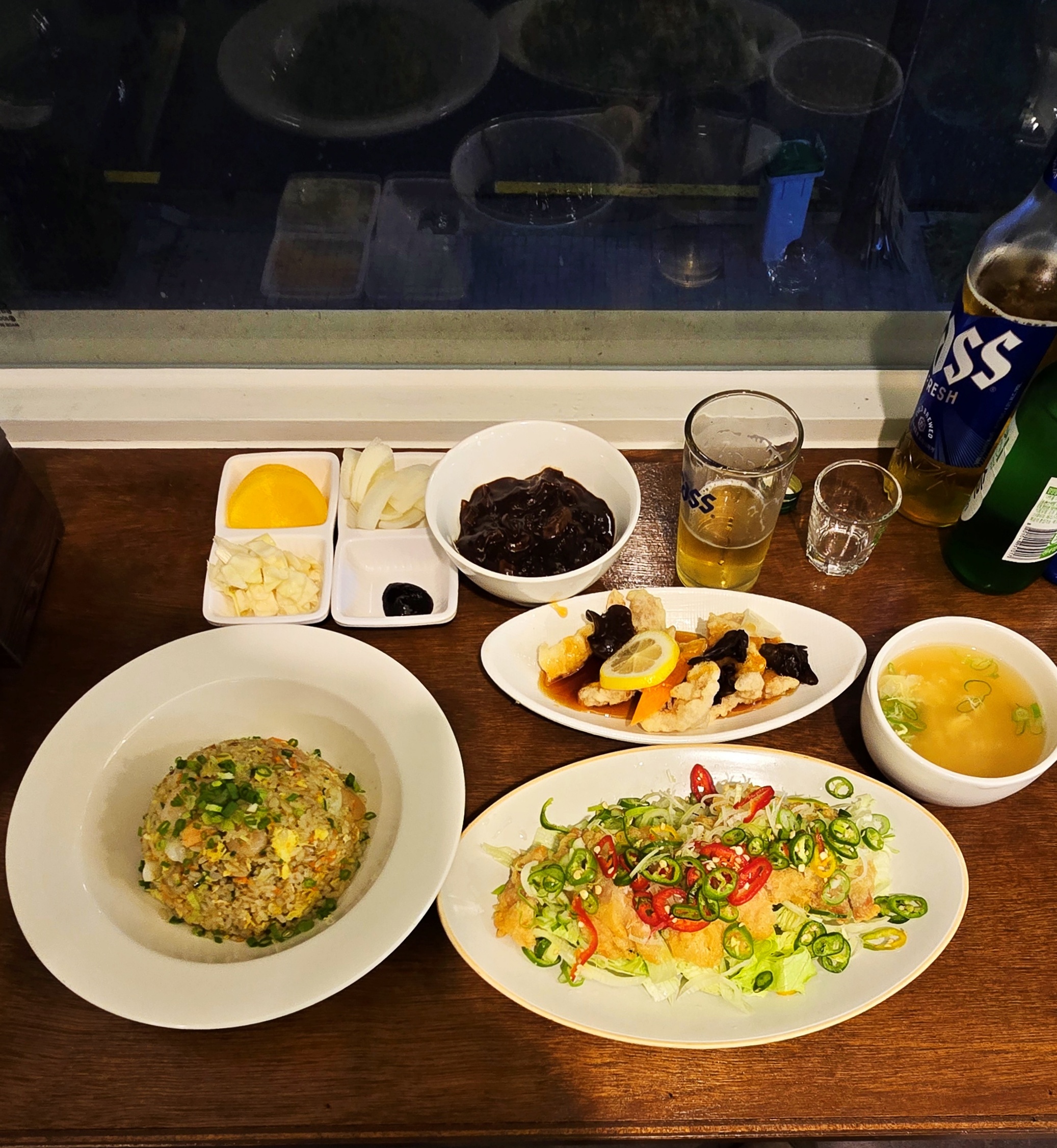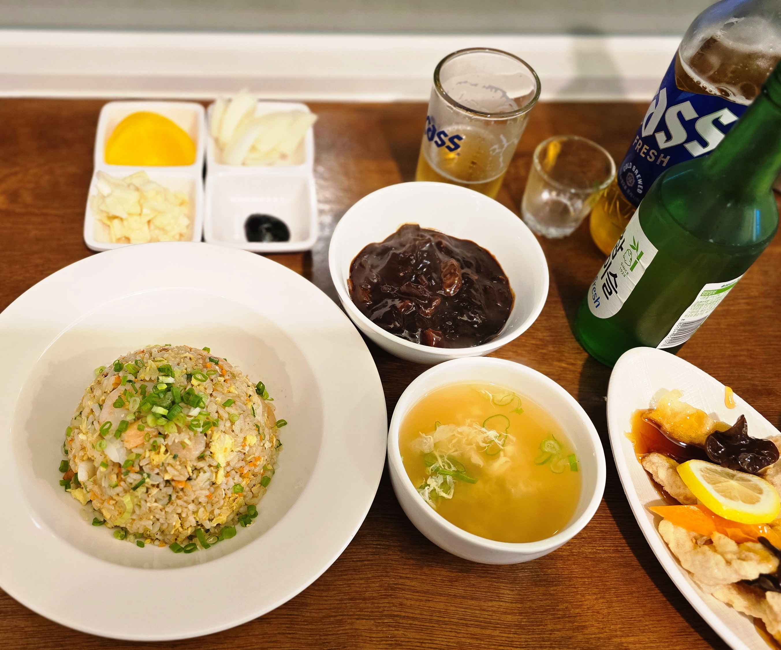 볶음밥, 짜장 소스, 계란국, 기본찬, 맥주와 소주까지 혼술을