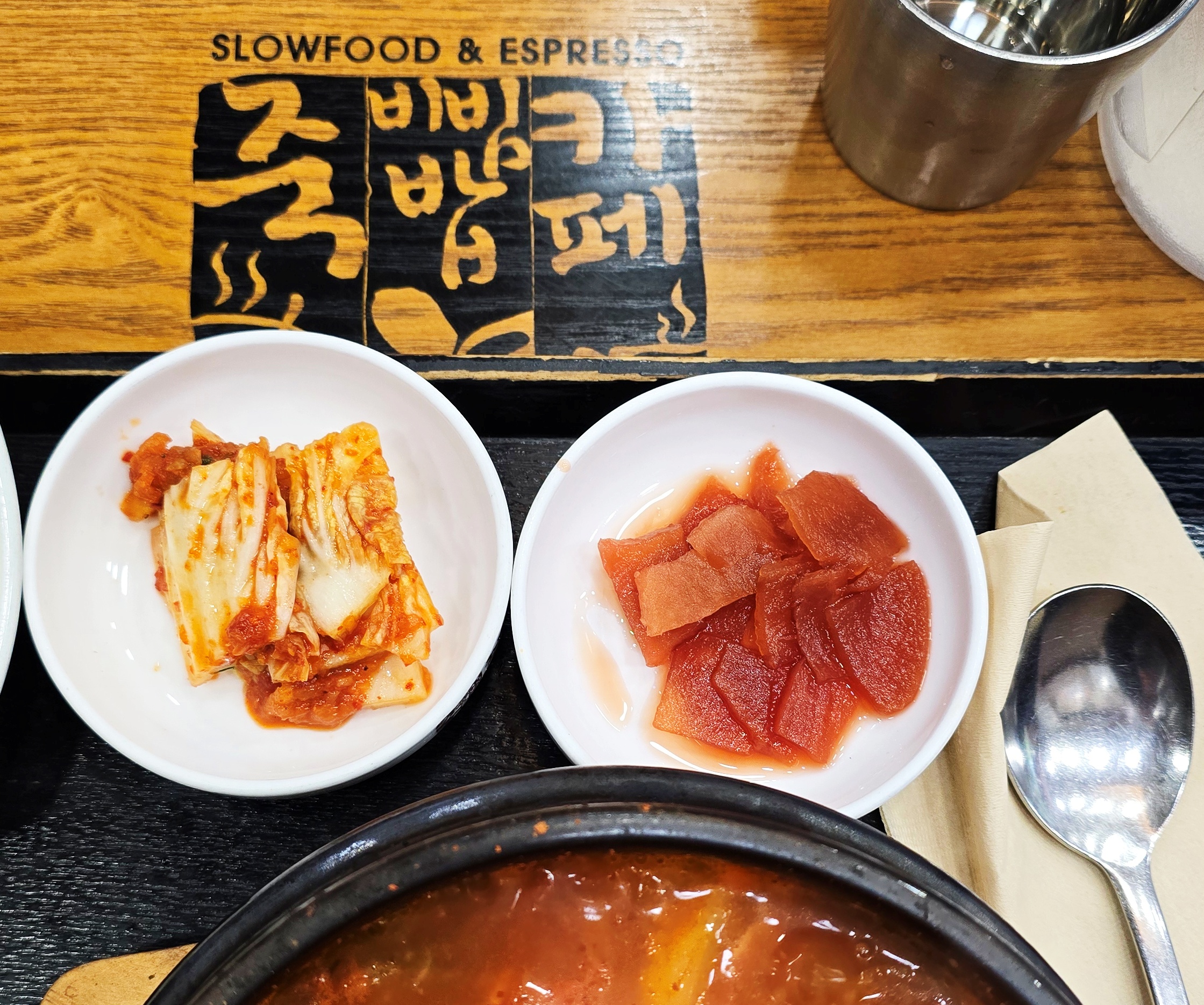 반찬은 깔끔한 배추김치와 새콤달콤 장아찌, 그리고
