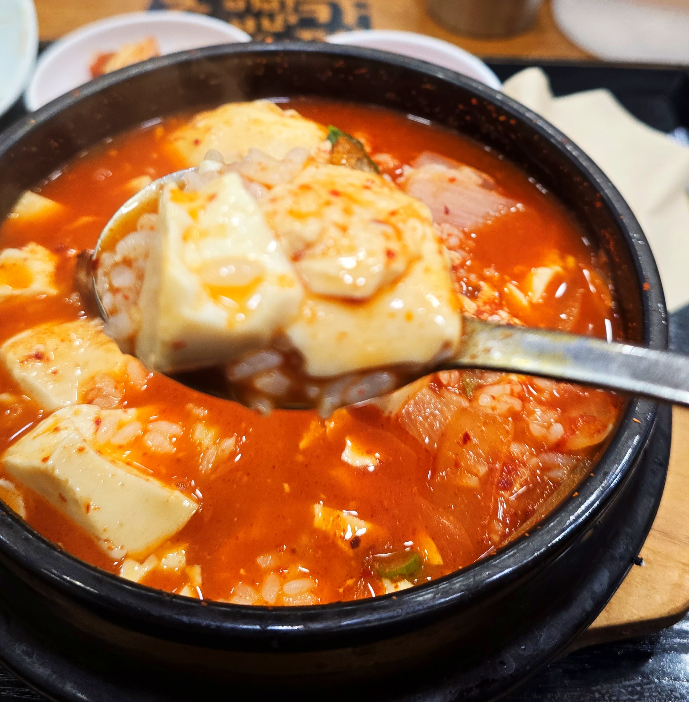 뜨거운 뚝배기에 가득 담긴 순두부찌개는 칼칼한 양념과