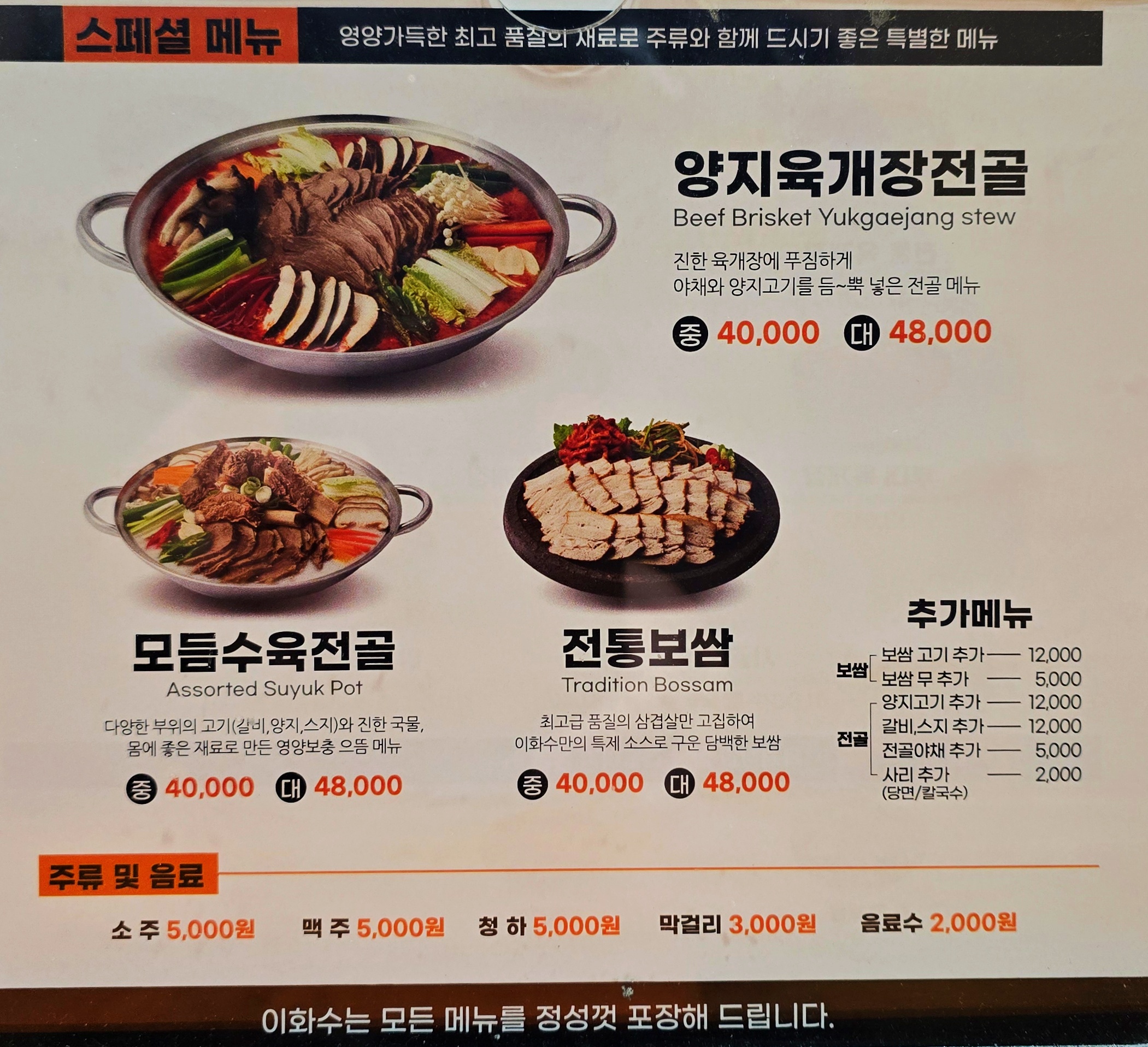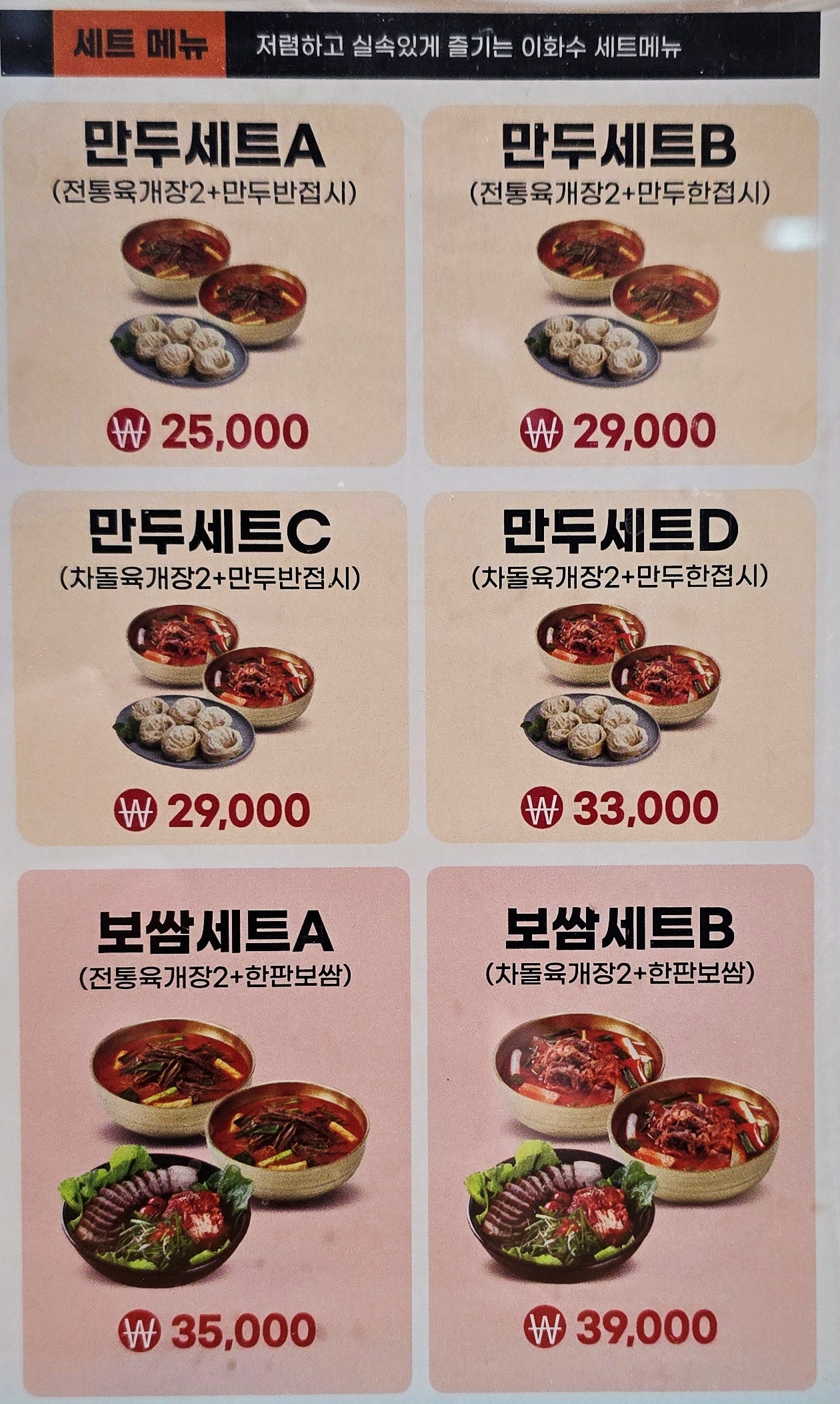 만두세트·보쌈세트·전골류까지 있어 다양하게 즐길 수 있습니다.