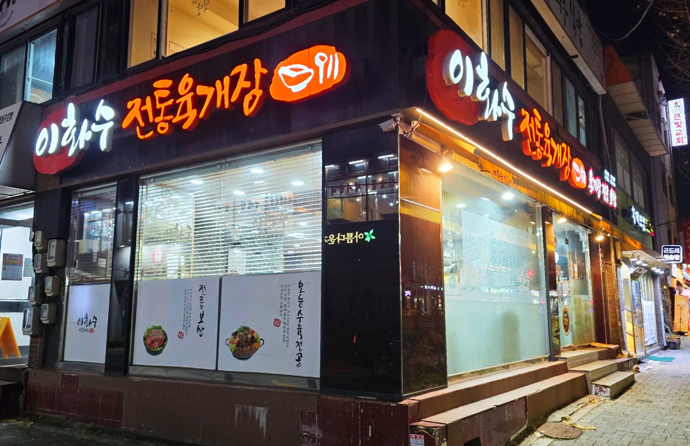 저녁 시간대 방문이라 간판 조명이 더욱 선명하게 반짝입니다.