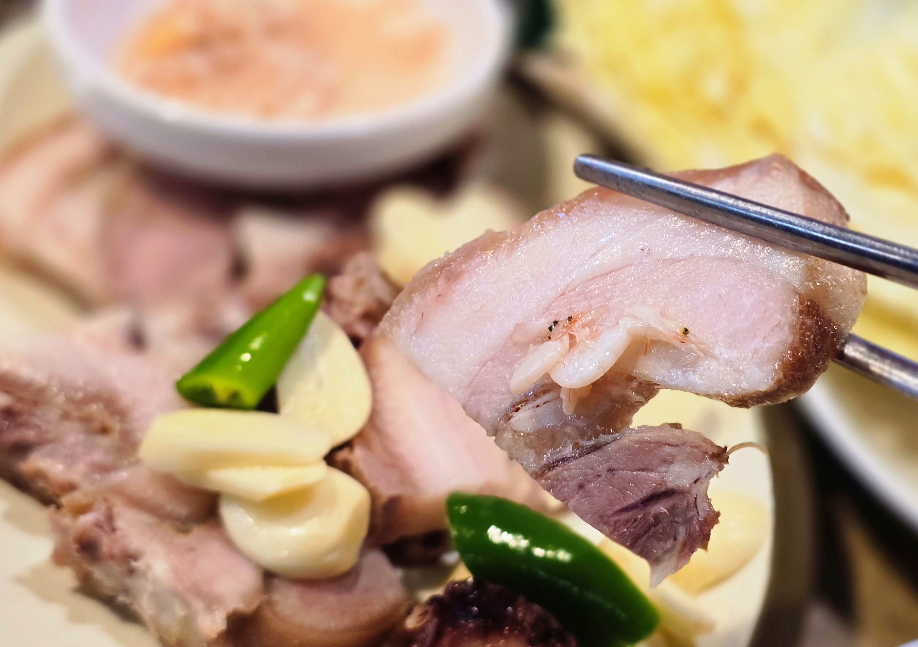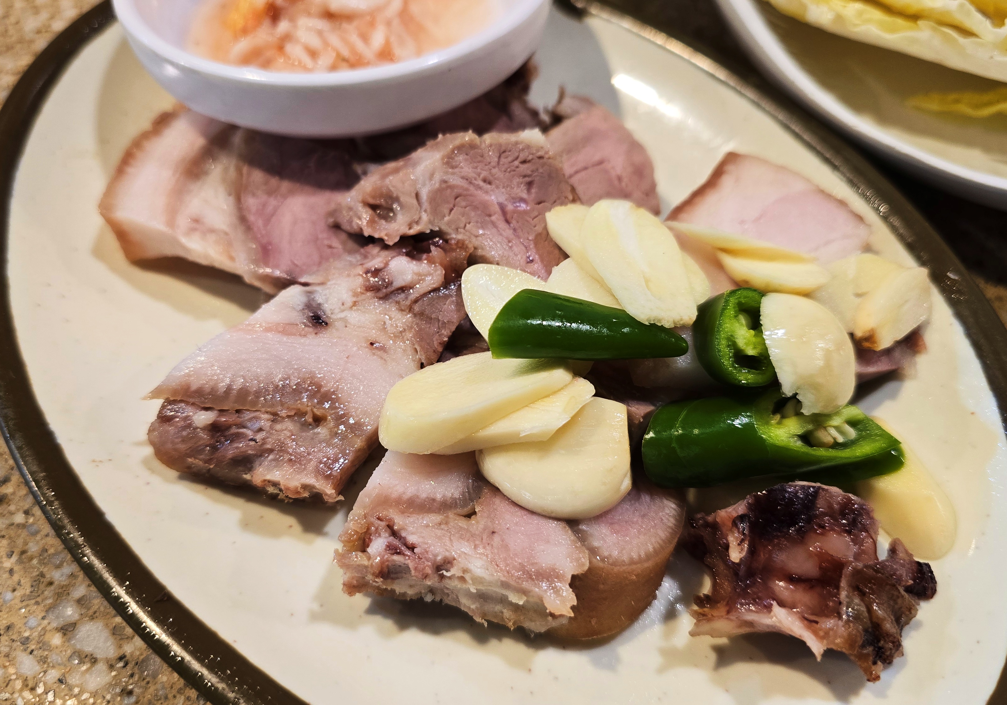 두툼하게 썰린 머릿고기에 마늘과 고추를 올려