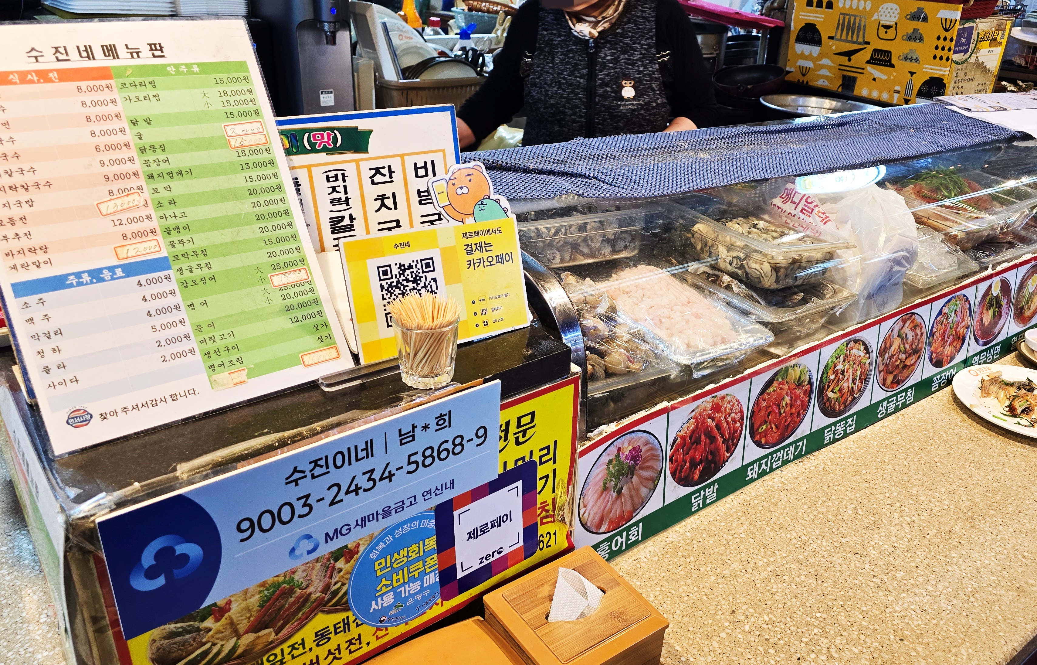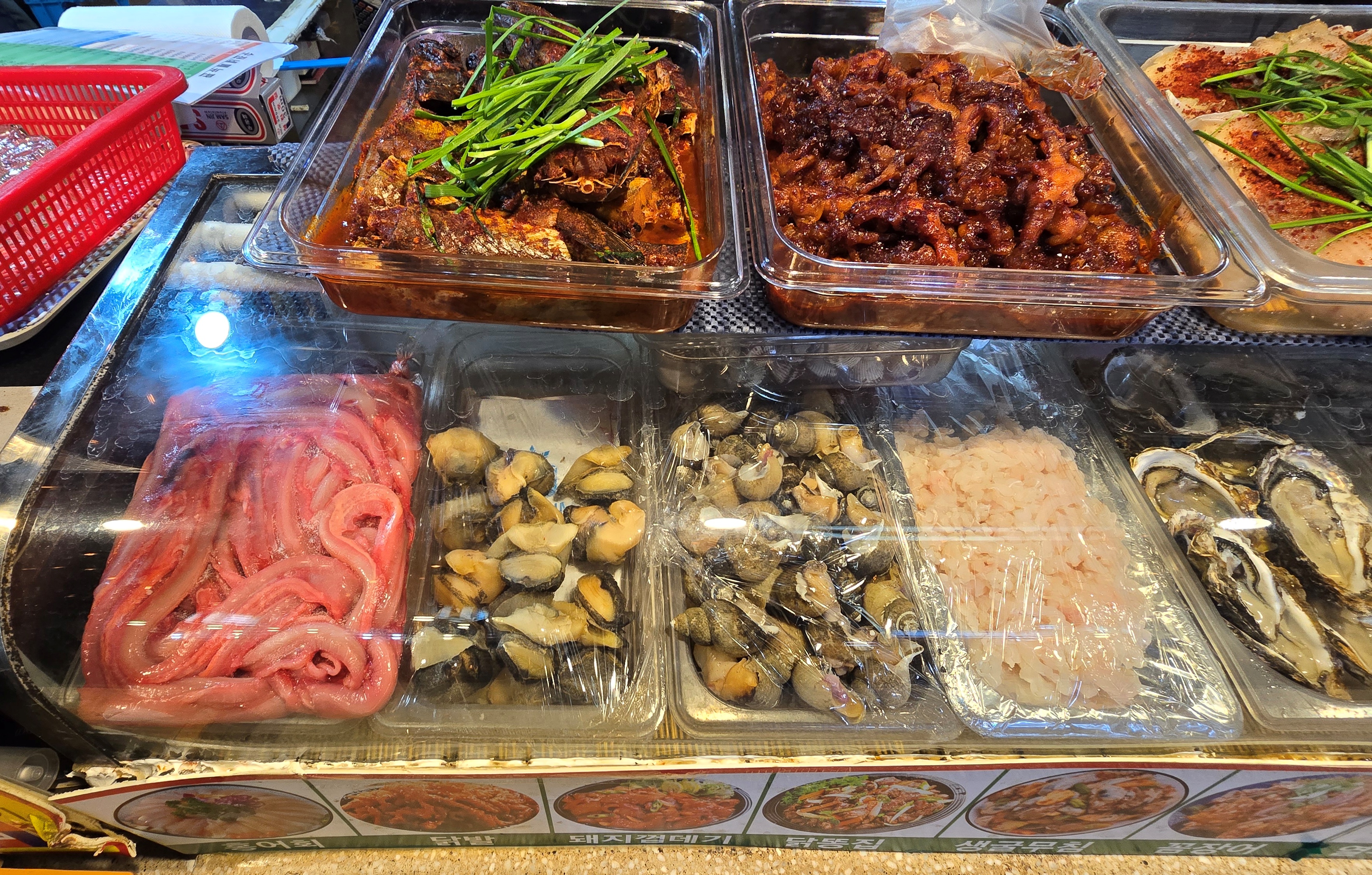 유리 진열대 아래에는 생굴, 생골뱅이, 생선살,