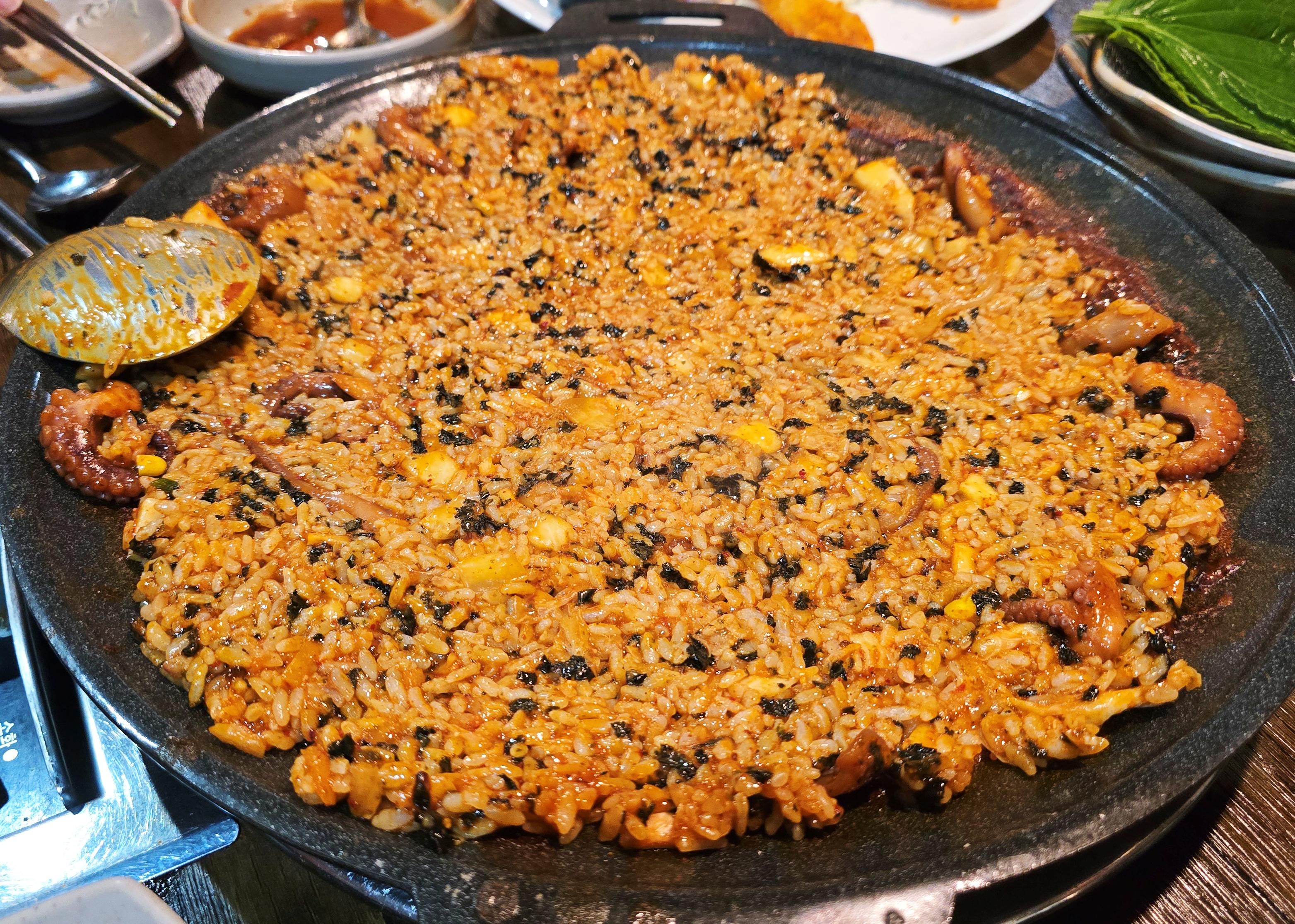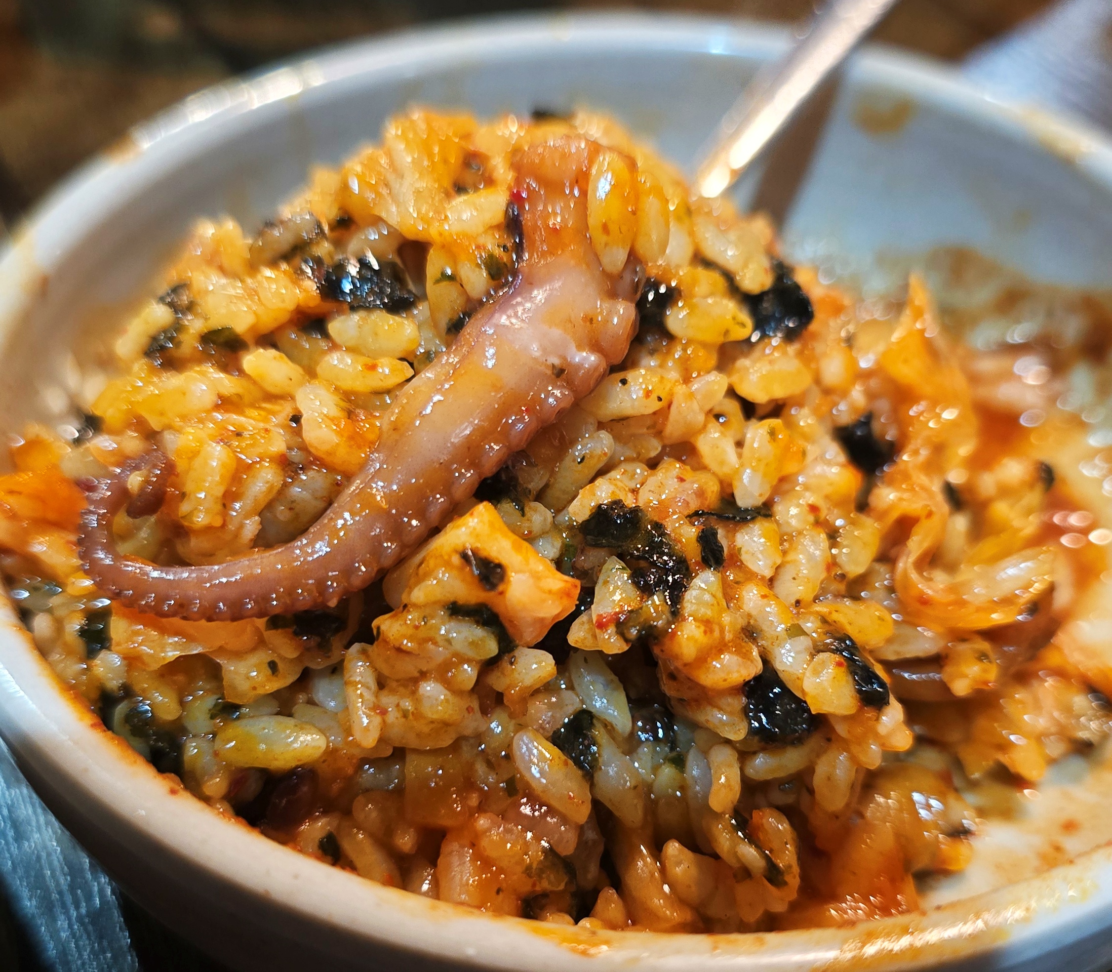 바삭한 누룽지층까지. 김가루, 양념, 쭈꾸미 조각이 밥과