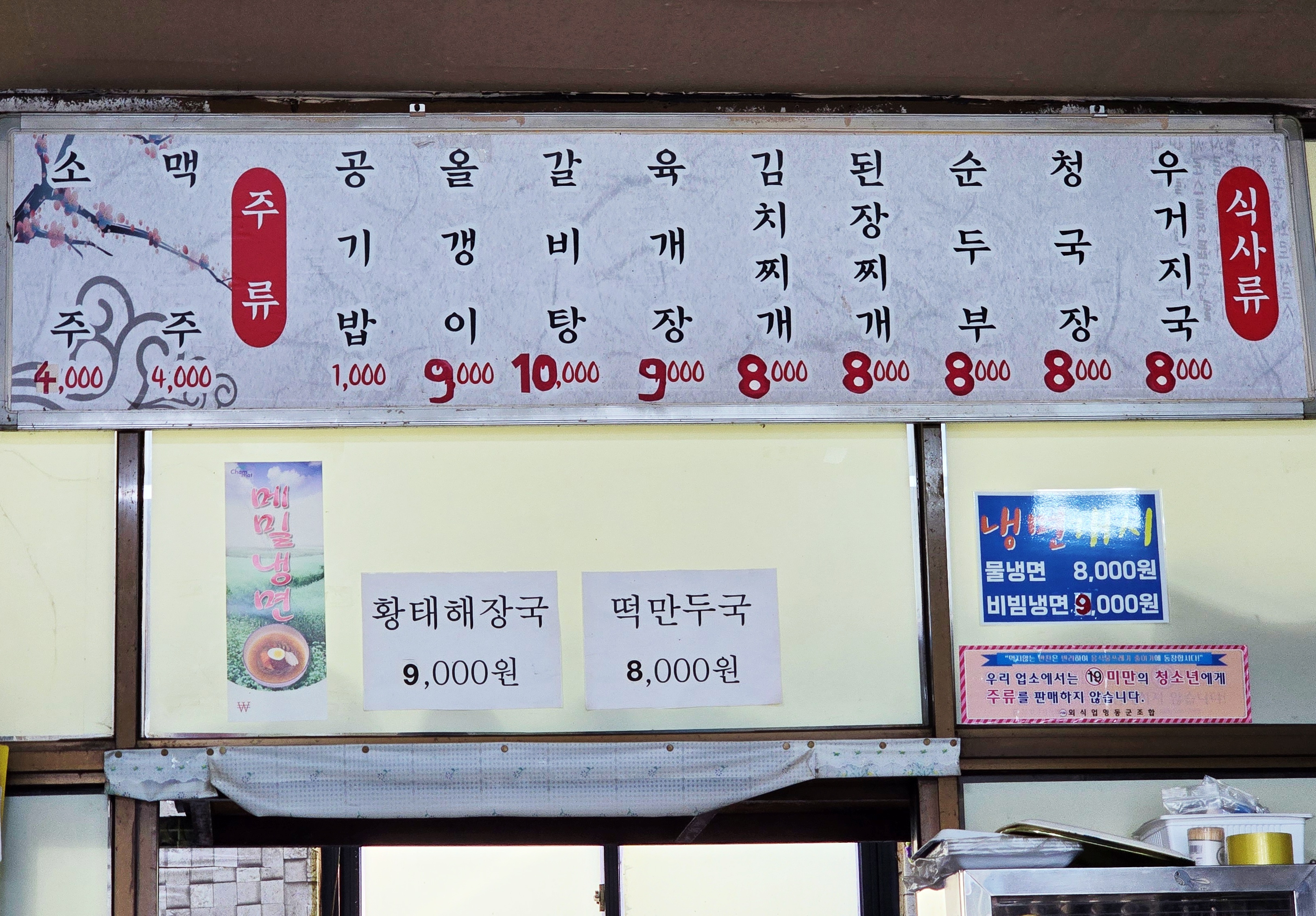 우거지국 8,000원, 갈비탕 10,000원, 콩비지 9,000원, 황태해장국 9,000원,