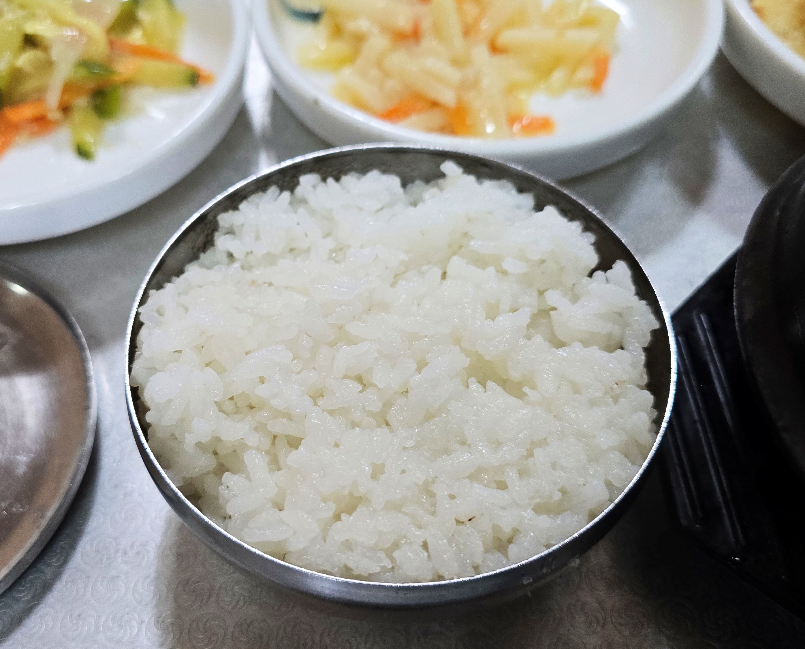 밥은 스테인리스 공기에 담겨 나오는데, 윤기가 흐르며