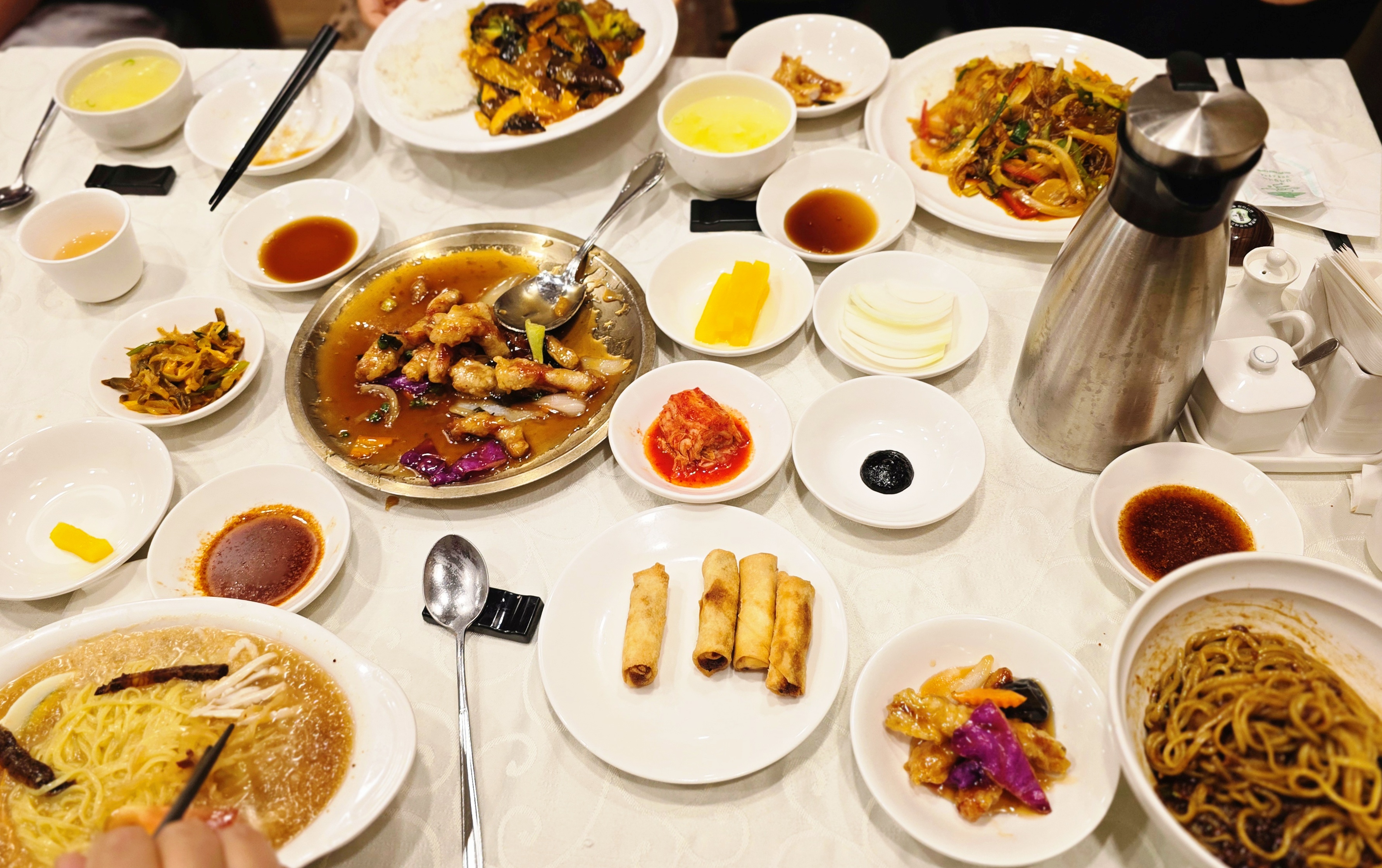 중앙에 탕수육, 각자 앞에는 개별 식사 메뉴가 깔끔하게 세팅
