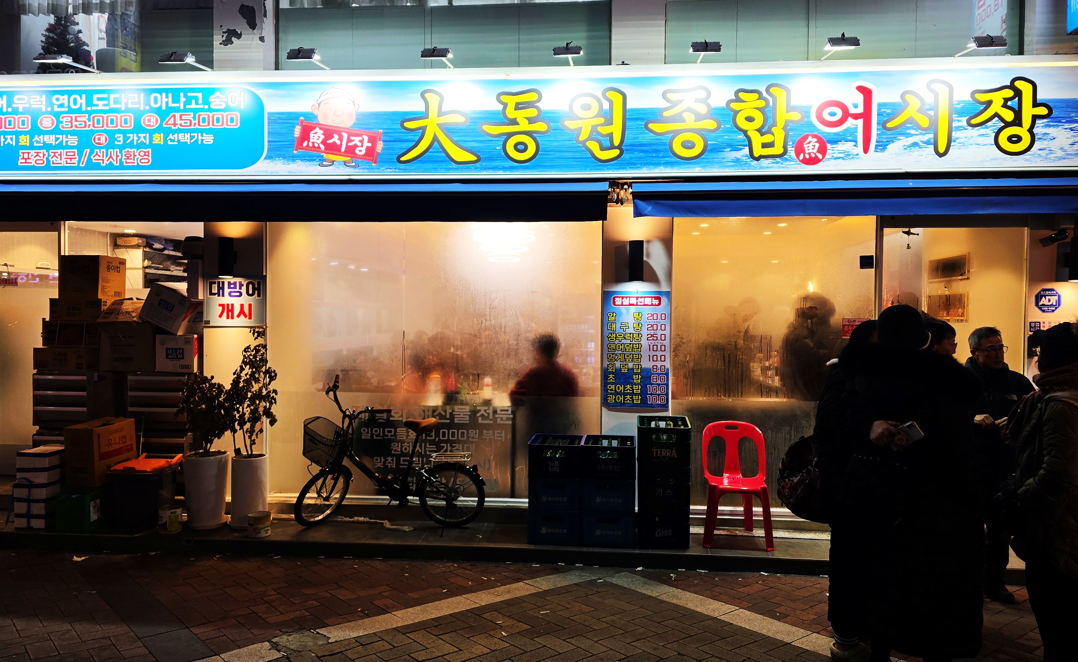 출구에서 도보 1~2분 거리의 대동원종합어시장. 늦은 시간까지